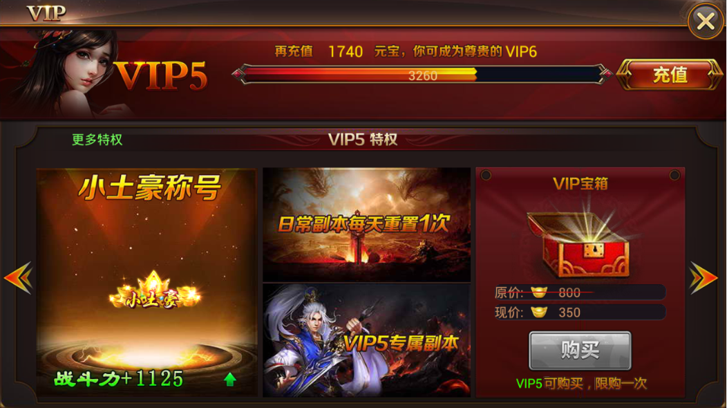 3、 在每一个VIP等级段都可购买一次对应等级VIP的尊享礼包,礼包是一次性的,不可重复购买;