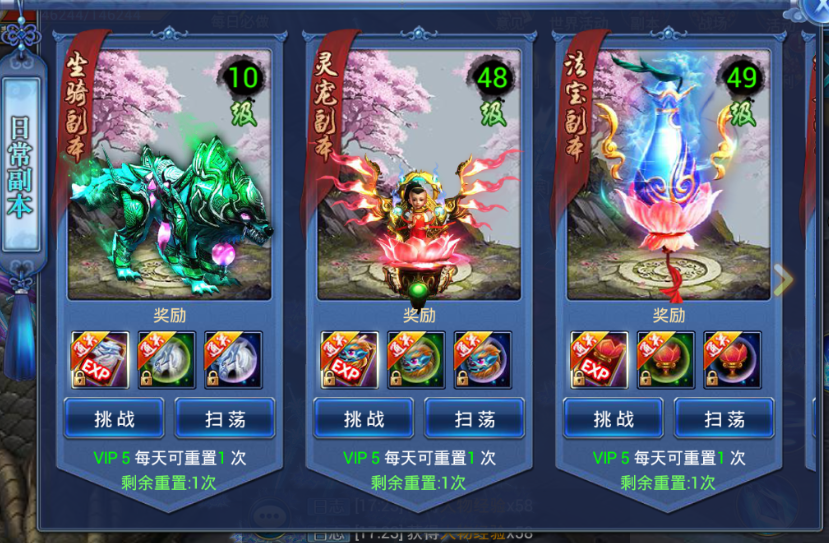3、 可通过重置功能来增加挑战次数,不同的VIP等级拥有不同的重置次数;重置需要消耗元宝,重置的次数越多,则消耗的元宝越高;