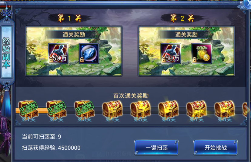 2、 经验副本每一关首次通关都可获得通关奖励,该奖励只能获得一次;