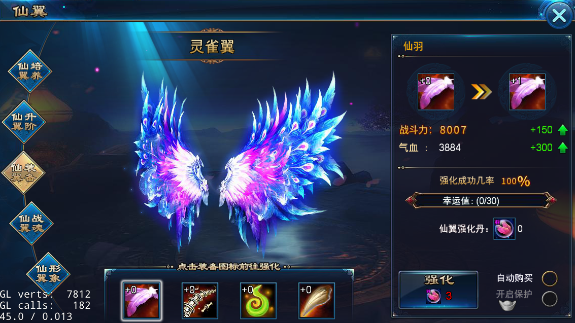 1、 仙翼装备强化需消耗仙翼强化丹;